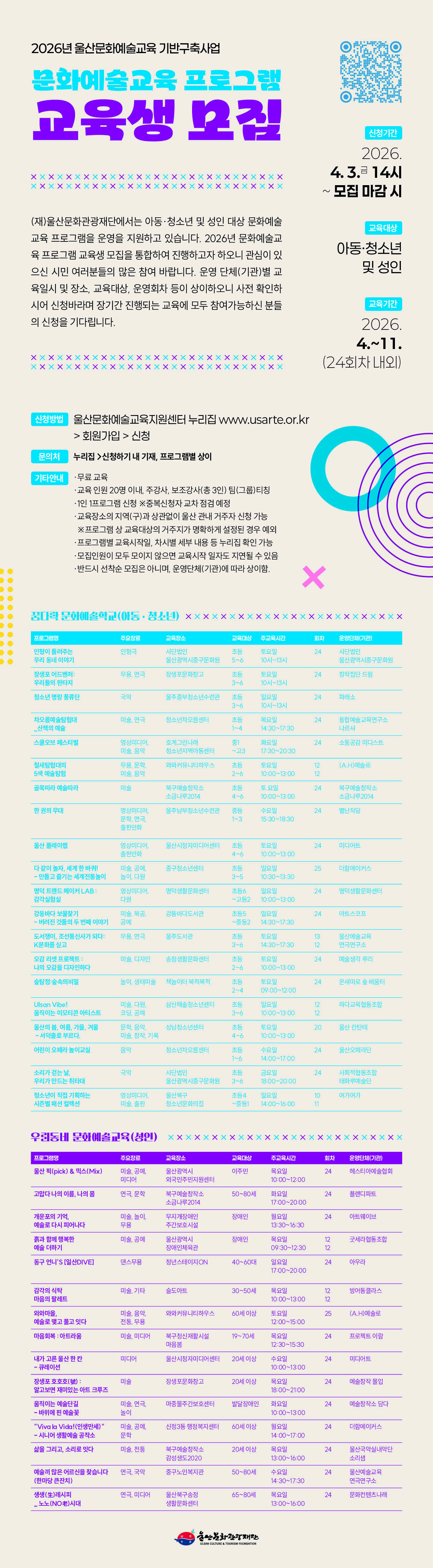 (재)울산문화관광재단에서 아동·청소년을 대상으로 무료 문화예술교육 프로그램에 참여할 교육생을 모집하오니 주민 여러분의 많은 관심 바랍니다.