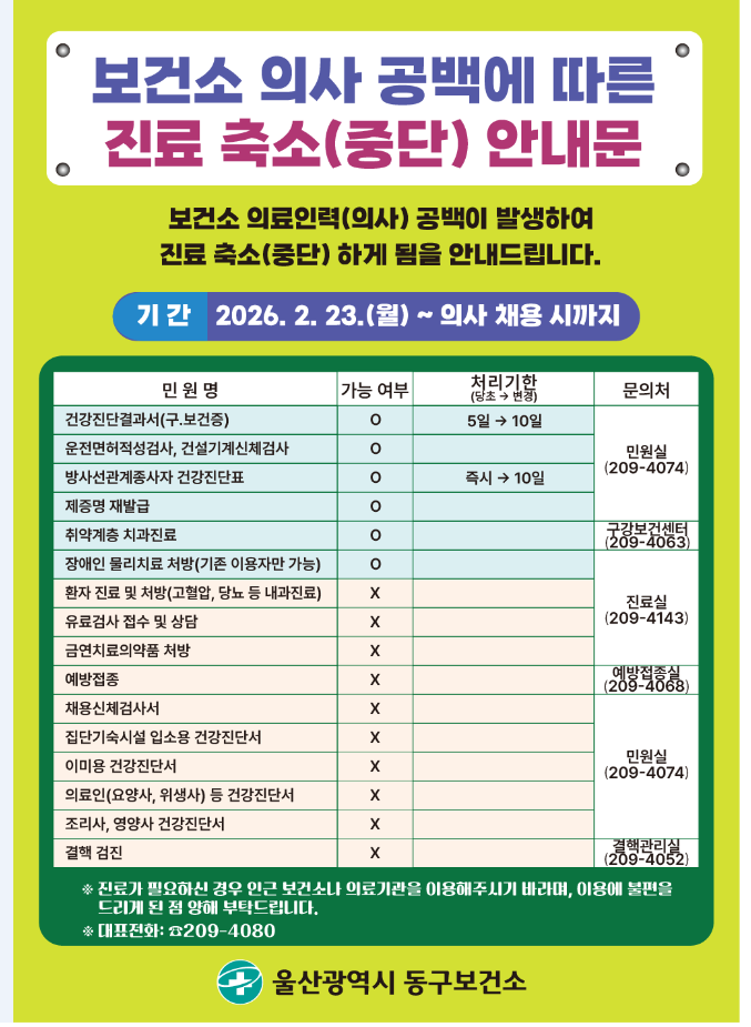 보건소 의료인력(의사) 공백이 발생하여 진료 축소(중단)하게 됨을 안내드립니다.
