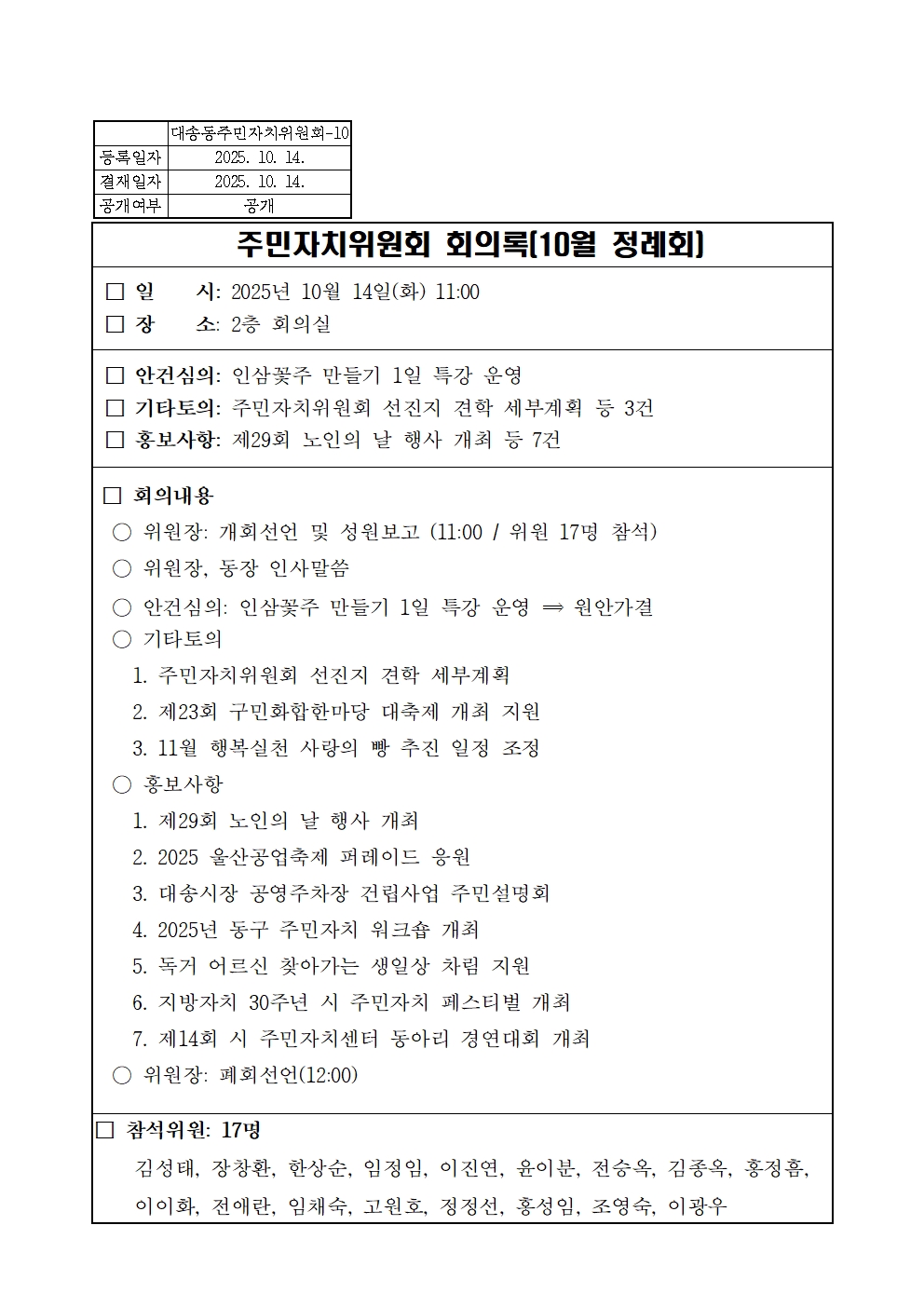 2025년 10월 주민자치위원회 정례회 회의록