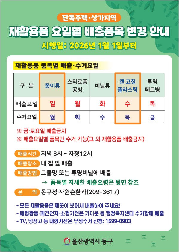 2026년 1월 1일부터 재활용품 요일별 배출품목 변경사항을 다음과 같이 알려드립니다.