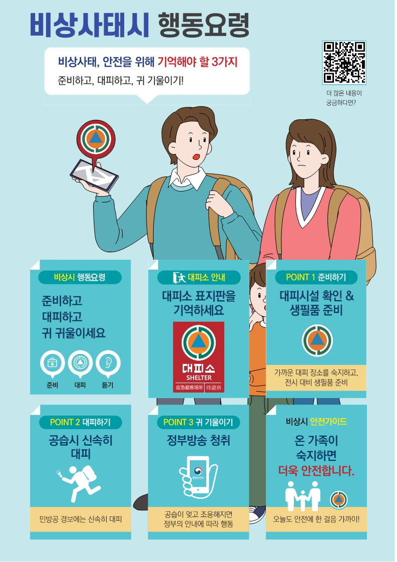 1. 대피시설 확인 & 생필품 준비 2. 공습시 신속히 대피 3. 정부방송 청취 온 가족이 숙지하면 더욱 안전합니다.