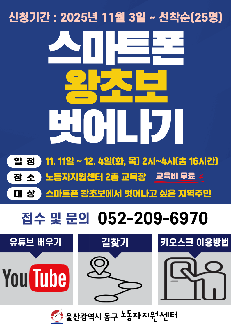 동구 노동자지원센터에서 "스마트폰 왕초보 벗어나기" 과정 참여자를 모집합니다.