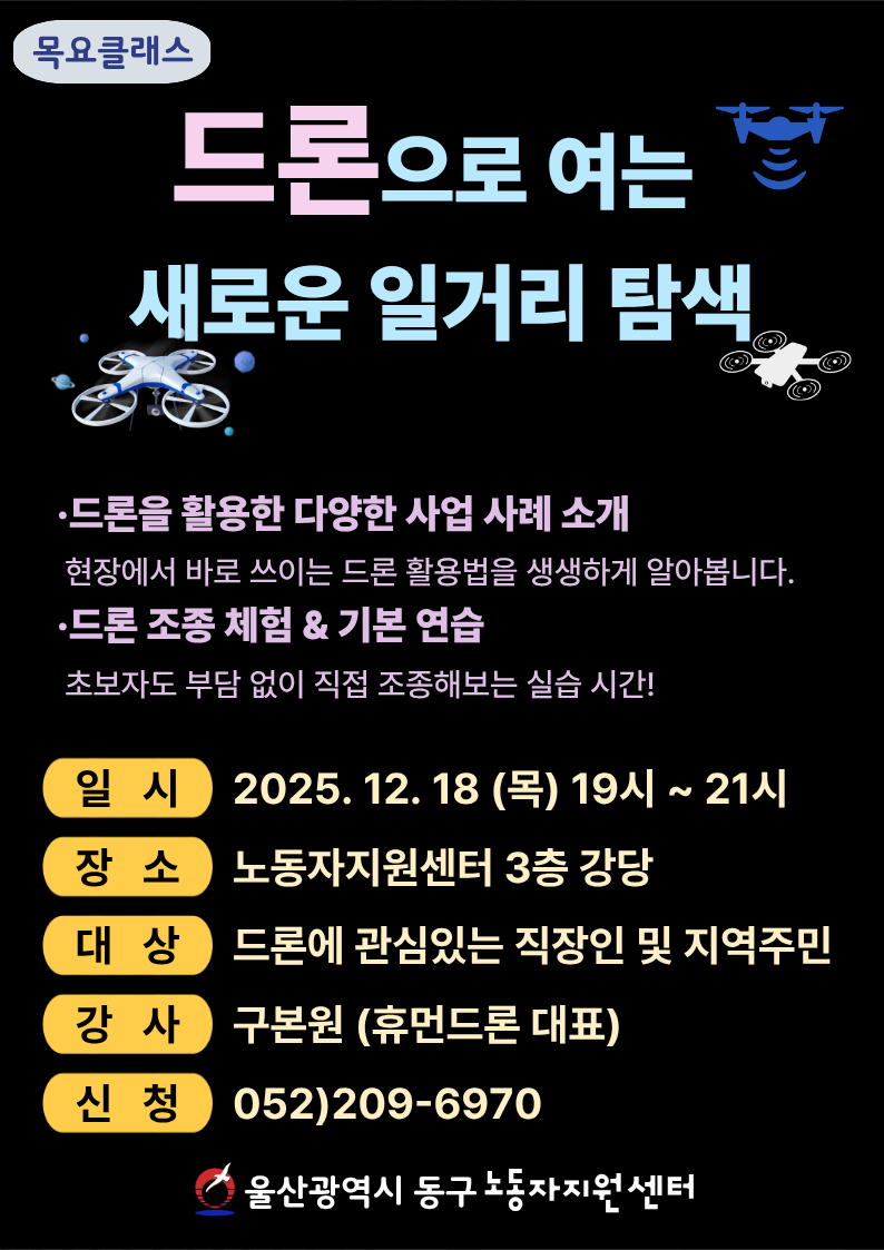 노동자지원센터, 12월 목요클래스 '드론으로 여는 새로운 일거리 탐색' 강좌 개최