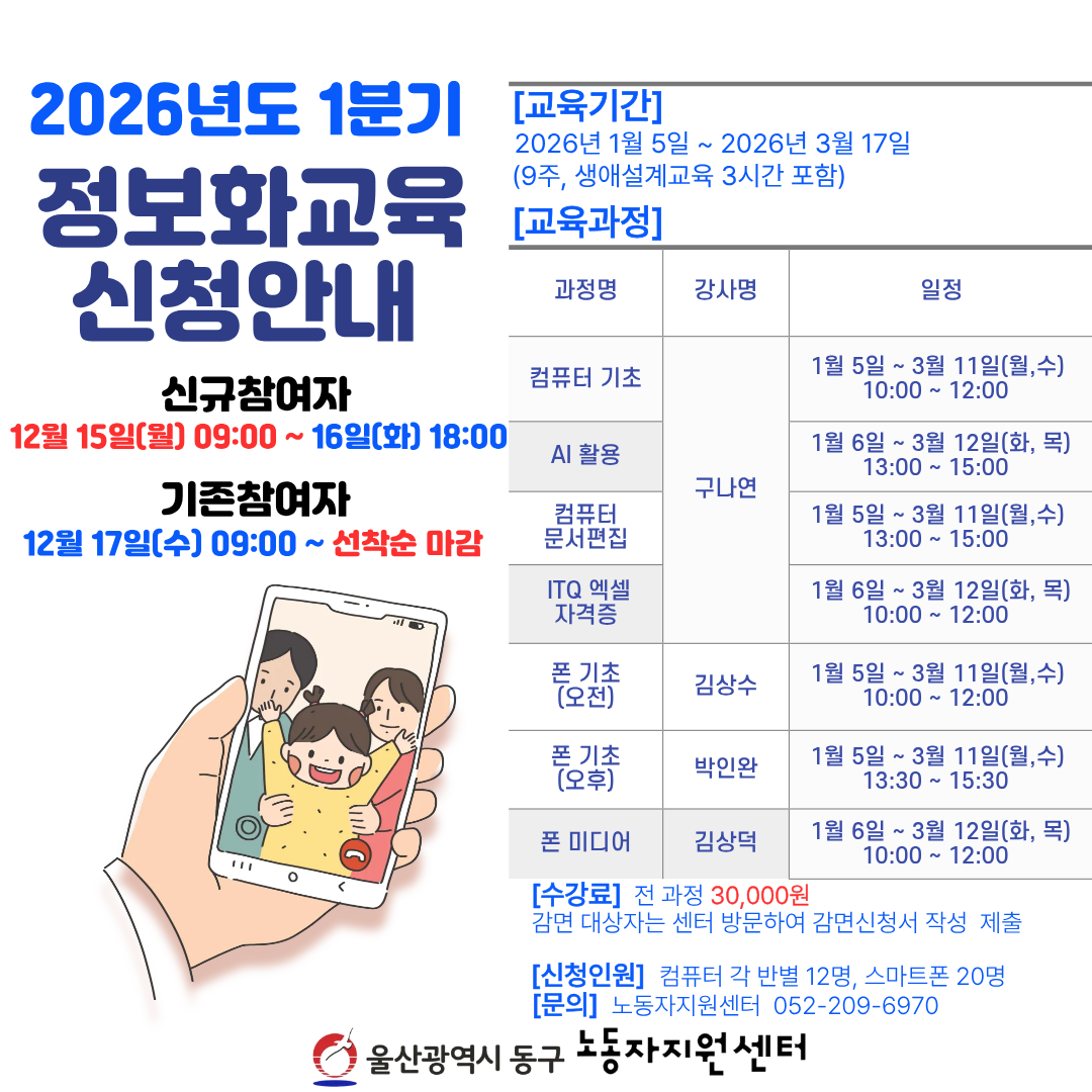 동구 노동자지원센터에서는 아래와 같이 정보화교육을 개설합니다.