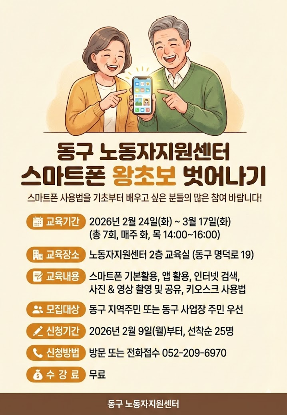 동구 노동자지원센터에서 "스마트폰 왕초보 벗어나기" 과정 참여자를 모집합니다.