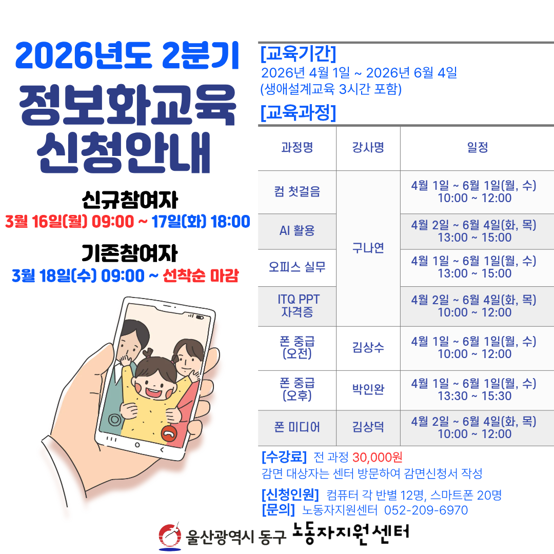 동구 노동자지원센터에서는 아래와 같이 정보화교육을 개설합니다.