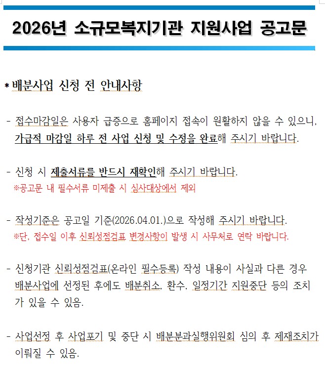2026년 소규모복지기관 지원사업 공모 안내