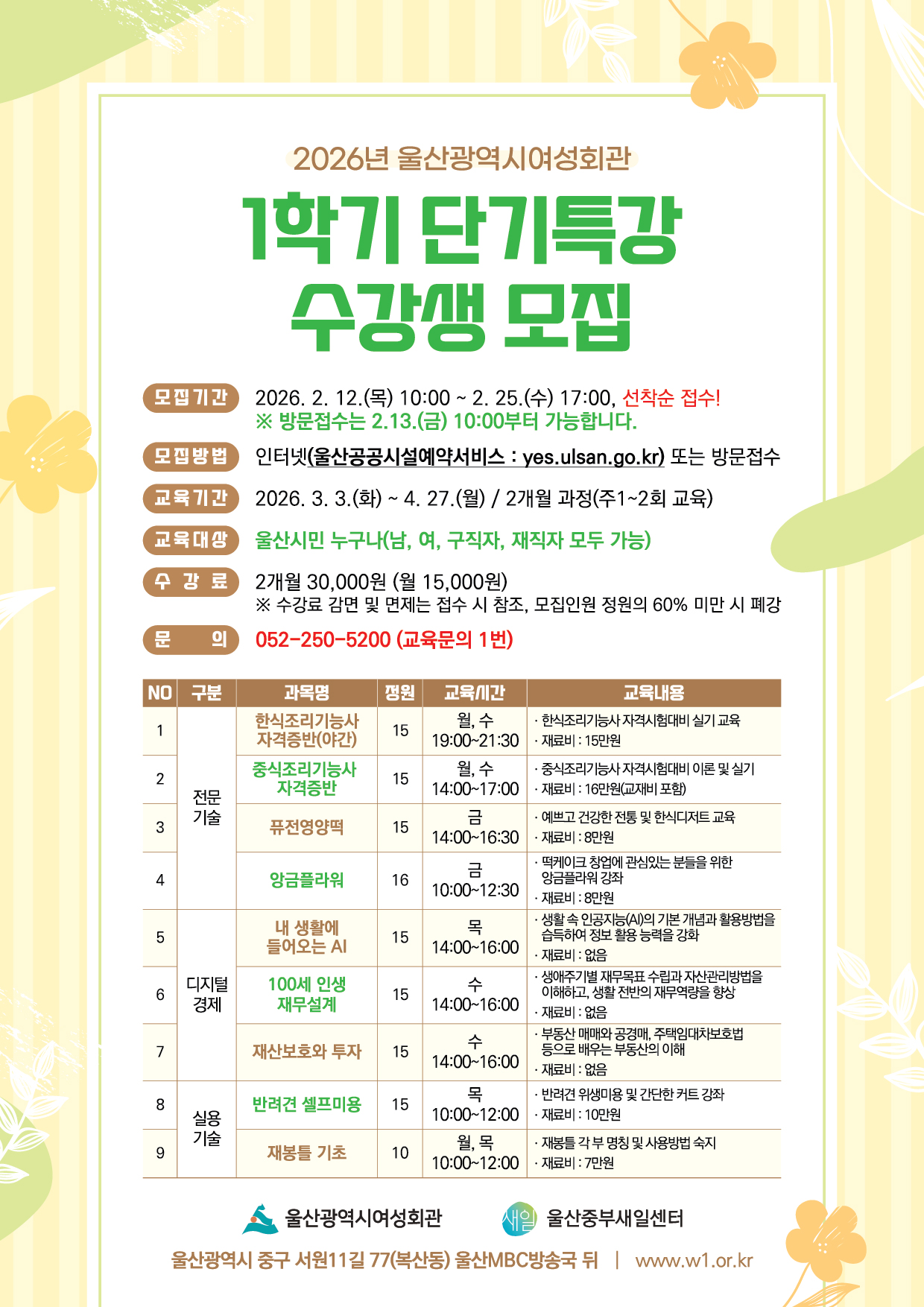 2026년 1학기 울산광역시여성회관 단기특강 수강생 모집 안내