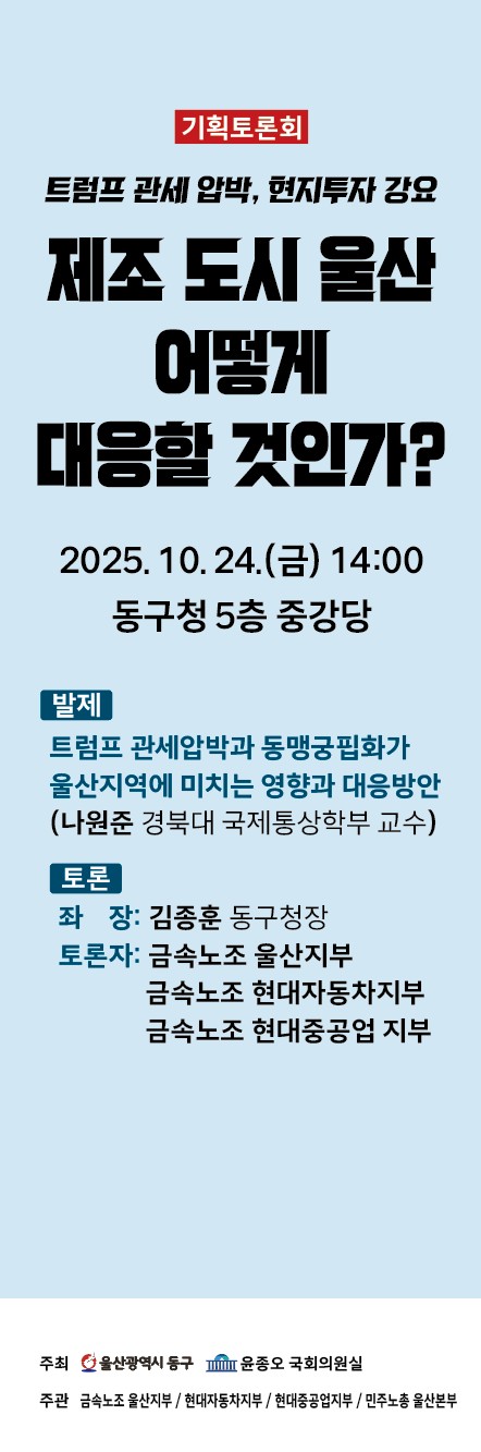 기획토론회(트럼프정부 관세압박 관련 제조 도시 울산 어떻게 대응할 것인가?) 개최 안내