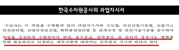 공사와 수자원기술주식회사의 계약서류에는 공사측의 노골적인 업무지시가 담겨 있다. 일반과업지시서는 수급자 책임과 관련해 “용수공급, 전력생산, 보 관리의 정상기능 발휘를 위해 필요하다고 인정되는 세부사항에 대하여는 감독원 지시에 따라야 한다”고 명시하고 있다. 감독원은 공사 내부조직이다. 특별과업지시서에는 “수급자는 시설관리시스템(DAON)과 K-Water에서 지급된 점검·정비전용 스마트폰을 활용해 수행 결과를 기록·관리하고 감독원의 확인을 받아야 한다”는 내용이 적혀 있다.