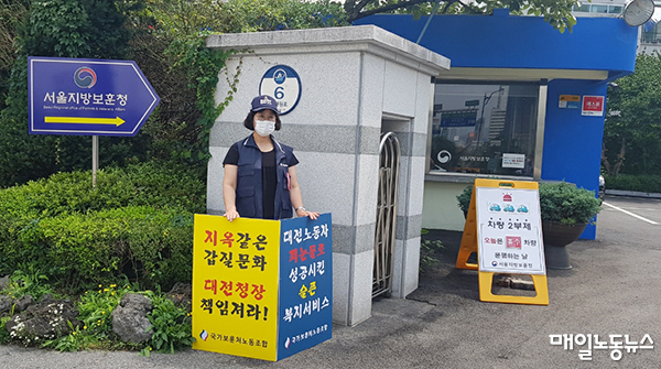 ▲ 국가보훈처노조는 지난달 30일 서울 용산구 서울지방보훈청 앞에서 대전지방보훈청에 보훈섬김이 노동환경 개선과 기관장 면담을 요청하는 1인 시위를 시작했다.