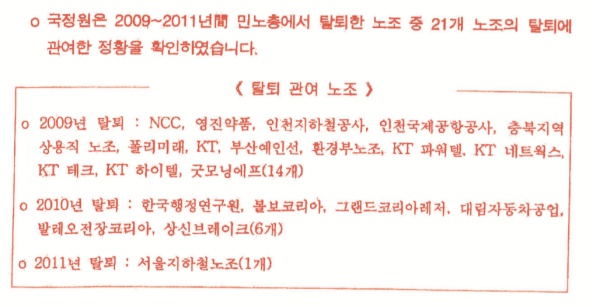 민주노총은 13일 오후 청와대 분수대 앞에서 기자회견을 열고 국정원 주도 노조파괴에 대한 진상규명과 국가 차원의 사과 및 책임자 처벌을 촉구했다. 더불어 진상 조사를 위해 국정원이 보유한 노조파괴 공작 자료가 투명하게 공개돼야 한다고도 강조했다. 국정원은 이명박 정권 시절인 2010년 2월부터 2010년 12월까지 총 176개의 노조파괴 문건을 작성해 청와대 사회수석실로 전달한 바있다.