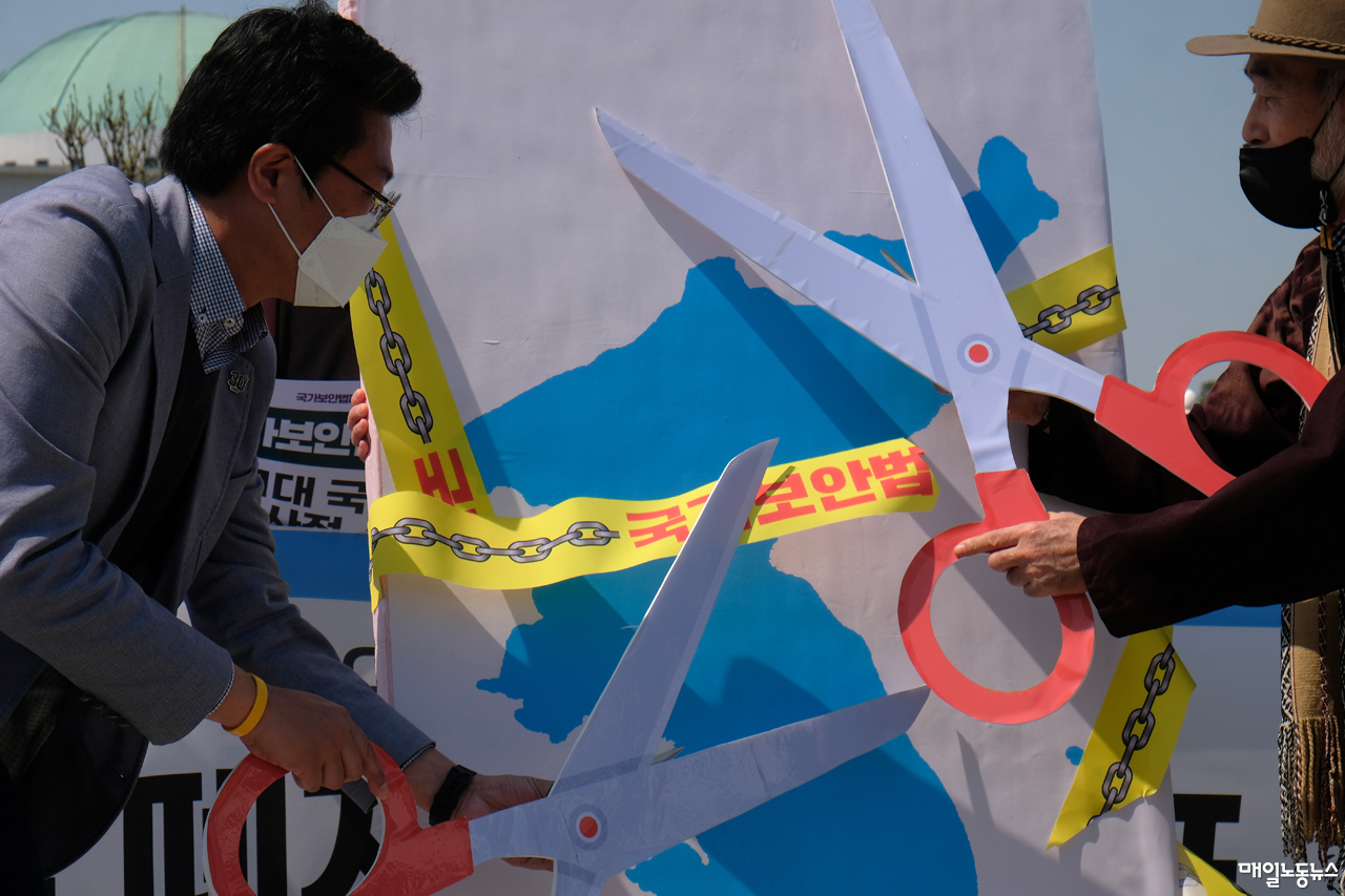▲ 민주노총과 민주사회를위한변호사모임 등 노동·시민·사회단체로 구성된 국가보안법폐지국민행동 회원들이 19일 오후 국회 앞에서 국가보안법 폐지를 촉구하는 기자회견 자리에서 국가보안법 사슬을 잘라내는 상징의식을 하고 있다.