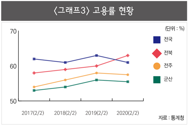 주력산업 붕괴로 광업·제조업 취업자수도 2017년 하반기 25만9천명에서 2020년 하반기 20만1천명으로 5만8천명 감소했다. 고용률은 같은 기간 52.6%에서 55.4%로 소폭 상승했지만 전북에서 가장 낮은 수준이다. <그래프3 참조>
