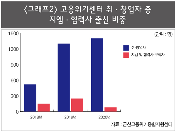 설립 초기만 해도 한국지엠·협력사 퇴직자가 이용자의 큰 비중을 차지했지만 특정기업 소속이 아닌 일반 구직자의 비중이 점점 커지고 있다.<그래프1·2 참조> 군산시에서 취업지원·센터운영을 수탁한 캠틱종합기술원의 이수진 군산고용위기지원센터 책임매니저는 “한국지엠 퇴직자들의 경우 기존 노동환경과 간극이 큰 탓에 상당수 다른 지역으로 이주한 것으로 보인다”며 “전업주부였던 중년여성들이 생계난으로 취업전선에 뛰어들며 이용률이 늘어나는 추세”라고 말했다.