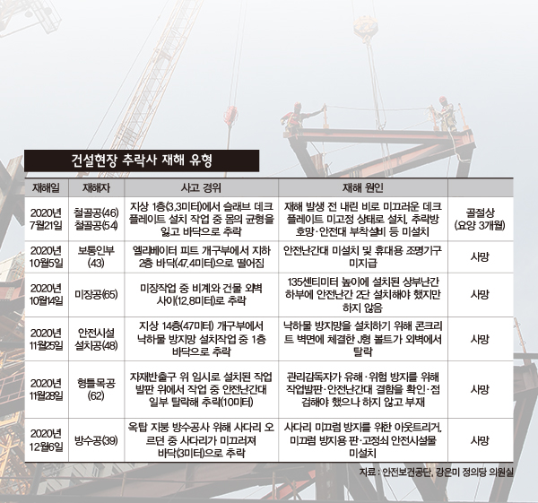 추락사고 6건의 피해자 7명(5명 사망, 2명 부상)은 나이가 39세부터 65세로 다양했다. 건설현장에서 하는 일은 물론 재해 경위도 모두 달랐다. 유일한 공통점은 안전난간대나 추락방호망 등 안전장치가 재해를 막을 만큼 충분히 갖춰지지 못했다는 사실이다. 사용자가 처음부터 재해 방지를 위한 노력을 하지 않거나, 공정 과정상 편의를 이유로 설치돼 있던 안전시설물을 서둘러 해체하면서 사고가 발생했다.