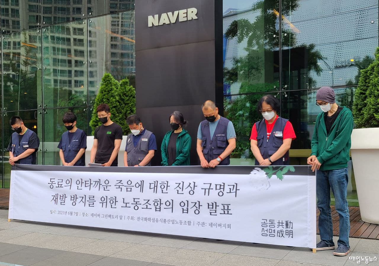 화섬식품노조 네이버지회(네이버사원노조 ‘공동성명’)는 7일 경기도 성남시 분당구 네이버 본사 앞에서 기자회견을 열고 “고인은 과도한 업무에 시달렸고 상급자의 부당한 업무지시와 모욕적 언행으로 정신적 압박을 받았다”며 “2년 가까이 문제를 개선하기 위해 사내 절차를 이용해 조치를 취했지만 회사는 이를 묵살하고 방조했다”고 밝혔다.