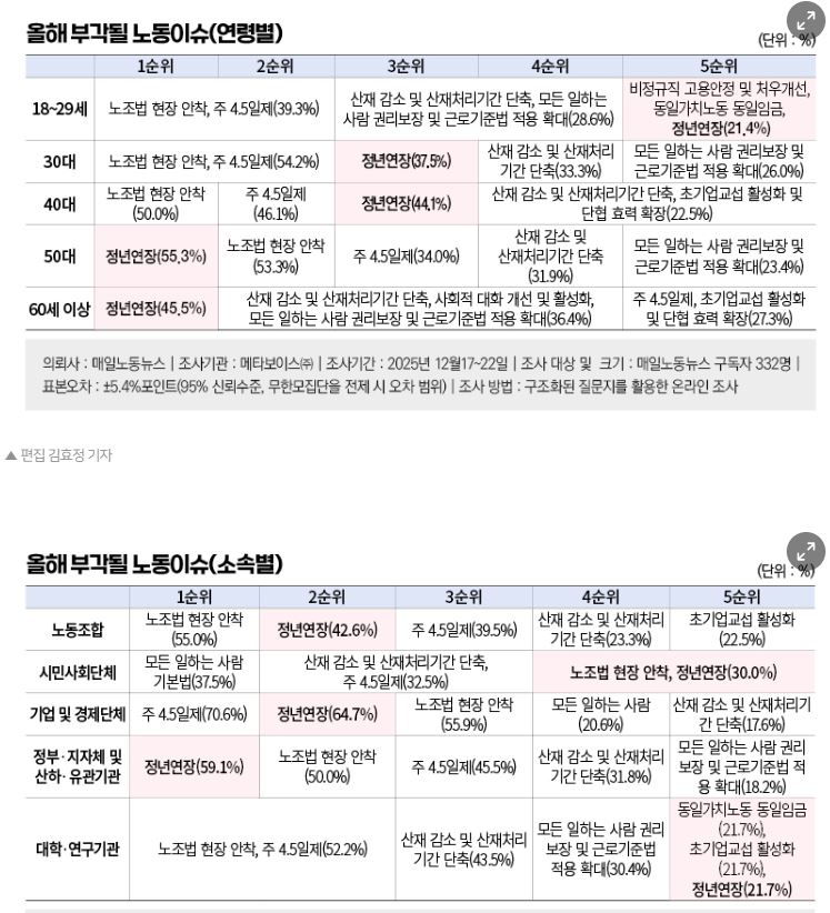 40대는 개정 노조법 현장 안착에 50.0%가 응답했지만, 주 4.5일제 포함 노동시간 단축(46.1%)과 정년연장(44.1%)도 고루 주목했다. 젊은 세대일수록 노동시간 단축에, 50대 이상은 노후 소득 보장에 시선이 쏠려 있는 셈이다.