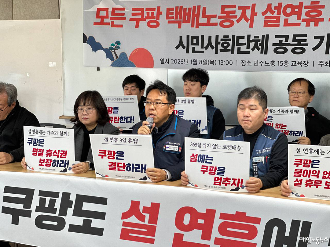 택배노동자과로사대책위원회는 8일 오후 서울 중구 민주노총 교육장에서 기자회견을 열고 쿠팡 택배노동자에게도 올해 설 연휴 최소 3일 휴무를 보장해야 한다고 요구했다.