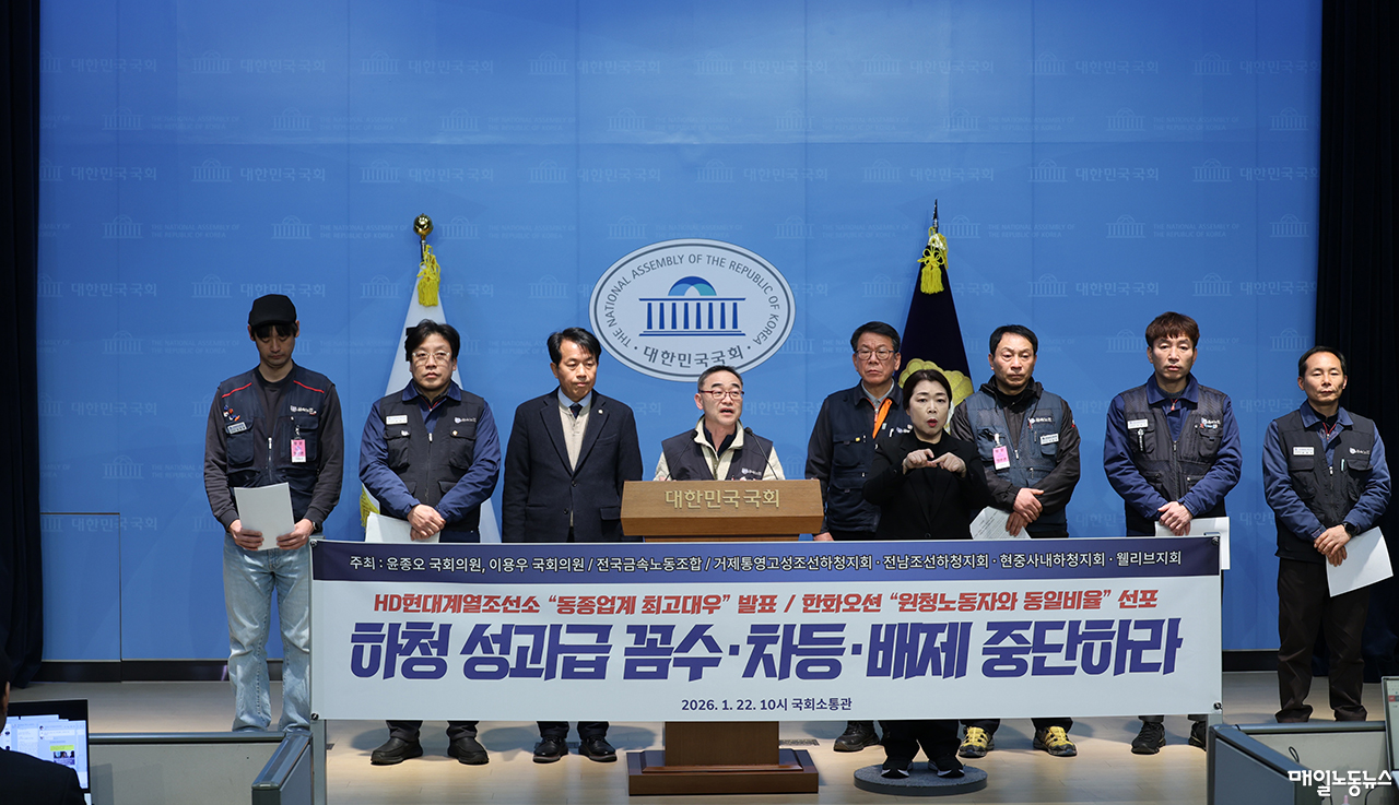 금속노조는 22일 오전 국회 소통관에서 기자회견을 열고 “HD현대중공업·HD현대삼호·한화오션 등 조선업 초호황으로 원청사는 지난해 천문학적 영업이익을 기록했다”며 “지난해 이재명 대통령이 한화오션 성과급 원하청 동일지급을 언급하자 한화오션은 부리나케 성과급 원하청 동일지급을 발표했지만 한 달이 지나도록 현장에는 소문만 무성할 뿐 실질적 변화는 일어나지 않고 있다”고 지적했다.