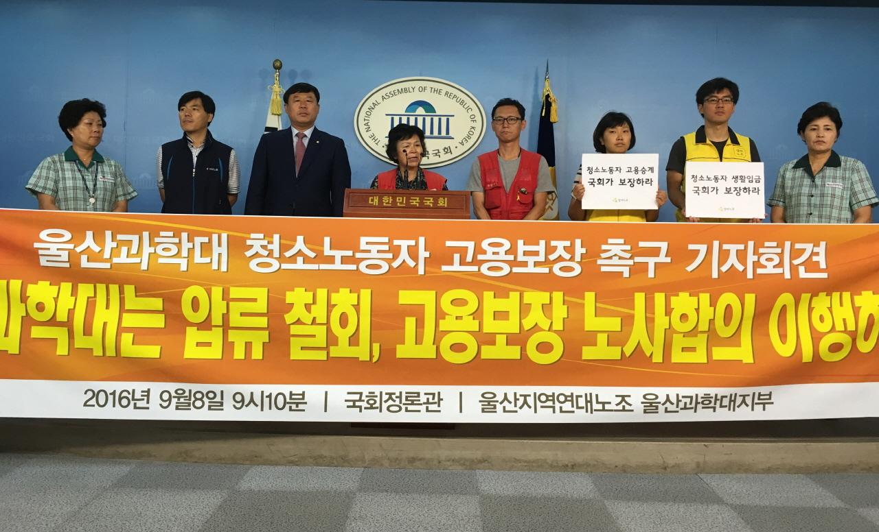 이들은 "울산과학대 청소노동자들은 지난 2007년 2월 어려운 노동조합을 만들었다는 이유로 집단해고를 당했지만 근로기준법 준수, 고용 보장을 요구하며 싸워 결국은 학교 측과 고용보장을 합의하고 원직 복직 했다"면서 "이후 노동조합은 근로조건 개선을 위해 지속적으로 노력했다"고 밝혔다.