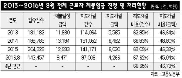 이는 박근혜 정부 들어서 최악의 수치로 기록되고 있다. 박근혜 정부 4년(2013~2016.8)간 지도해결 체불임금액 46.7%보다 1.7%포인트 적다. 이명박 정부 5년간 지도해결 체불임금액 54.6%에 비해서는 9.6%포인트나 떨어진다.