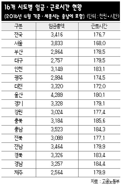 [노동부 시·도별 노동실태 조사] 노동시간 비슷하지만 지역별 주력업종 따라 임금편차 커