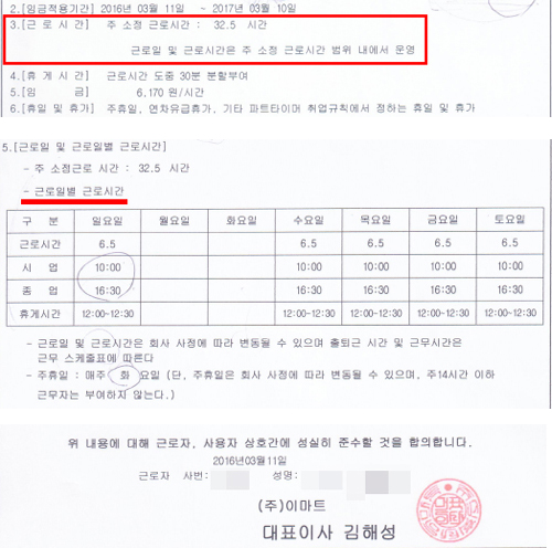 이마트는 김씨 근로계약서를 왜 본인 고지 없이 바꿨을까. 기간제 및 단시간근로자 보호 등에 관한 법률(기간제법)에 따르면 단시간근로자와 근로계약을 체결할 때 근로계약기간·근로시간·휴게·임금·휴일·휴가·업무에 관한 사항과 함께 근로일 및 근로일별 근로시간을 서면으로 명시해야 한다(제17조). 이를 지키지 않은 사용자는 500만원 이하 과태료에 처해진다. 이마트는 기존 파트타이머 근로계약서에 주 소정근로시간(32.5시간)만 넣었을 뿐 근로일별 근로시간을 명시하지 않았다.