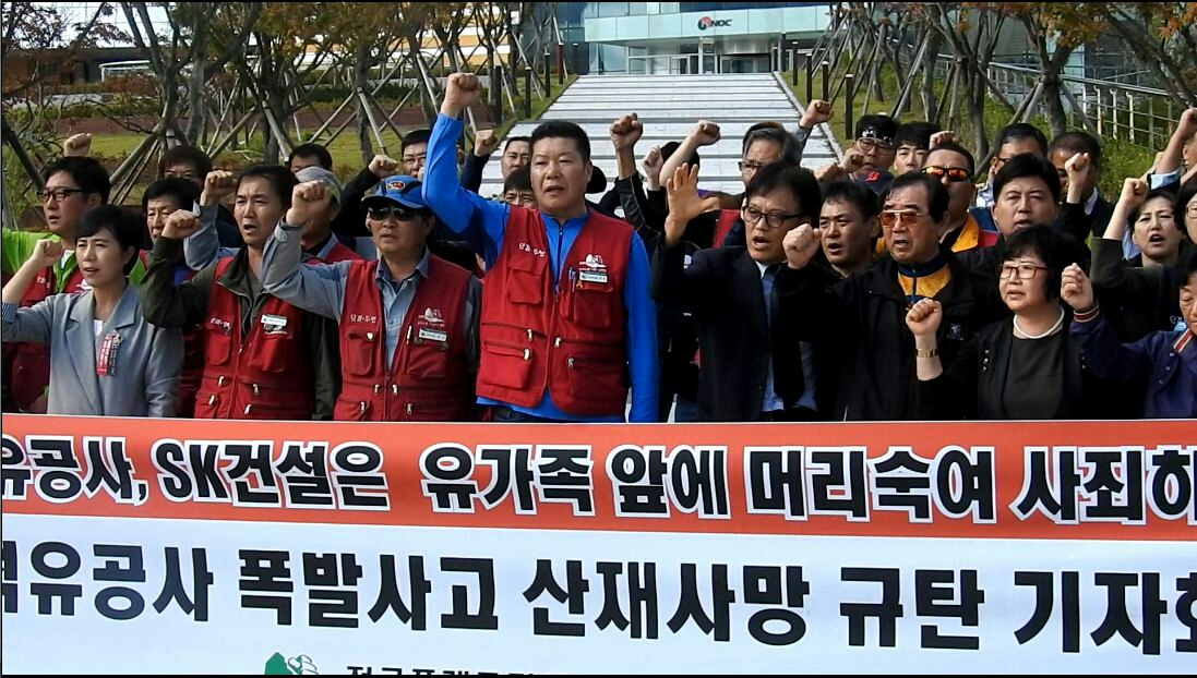 전국플랜트건설노조 울산지부(아래 플랜트노조)와 민주노총 울산본부, 진보정당, 유가족 등은 17일 오후 2시 울산 중구 유곡동 한국석유공사 본사(2014년 울산혁신도시로 이주) 앞에서 기자회견을 열고 "한국석유공사와 원청인 SK건설이 사람이 죽었는데 사과조차 없다"면서 "고인의 영정앞에 사과하라"고 요구했다.
