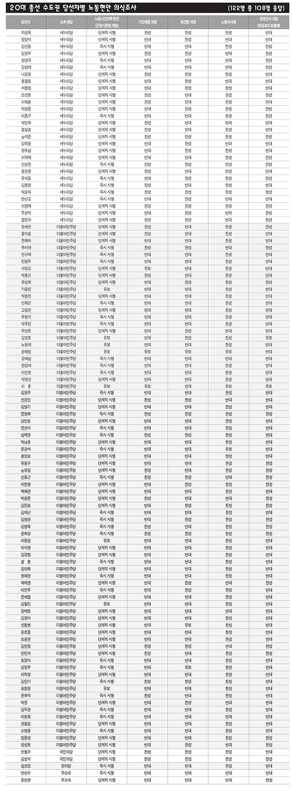 수도권 당선자 122명 중 14명을 제외한 108명(새누리당 28명·더불어민주당 75명·국민의당 2명·정의당 1명·무소속 2명)이 당시 의식조사에 답했다. 주요 답변 중 20대 국회에서 논의될 가능성이 높은 노동 5법 가운데 여야 이견이 큰 기간제법·파견법·근로기준법을 분석 대상으로 했다.