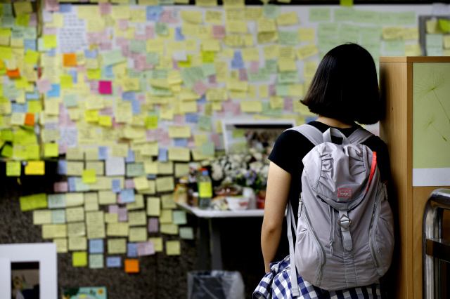▲ 서울 지하철 2호선 구의역 스크린도어 사고로 숨진 노동자 김아무개(19)씨를 추모하려는 시민들이 지난 2일 구의역을 찾아 고인을 위로하는 글귀를 쓰고 있다. 사고 현장 스크린도어 앞에는 시민들이 가져온 국화와 과자, 음료수, 컵라면 등이 쌓여 있다.