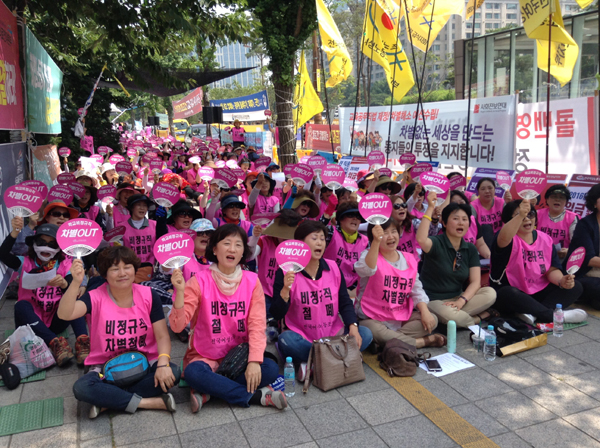 오후 1시30분이 되자 노란색 노조 소속 지부 깃발 아래 "비정규직 차별철폐"라고 적힌 분홍색 조끼를 입은 여성노동자들이 국민은행 앞으로 모여들었다. 조합원들은 선캡과 양산으로 햇볕을 막았다. 이들은 "정규직이 받는 정기상여금을 학교비정규 노동자에게도 달라"고 외쳤다. 국민은행 앞 인도를 채운 500여명의 조합원들은 “학교비정규직 차별 철폐하라”고 입을 모았다.