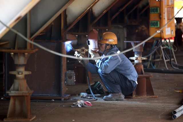 ▲ 조선업 불황으로 임금 체불에 시달리던 조선소 물량팀이 체당금을 받을 수 있는 길이 생겼다. 지난 5월18일 경남 거제의 한 조선소에서 일하는 노동자의 모습.