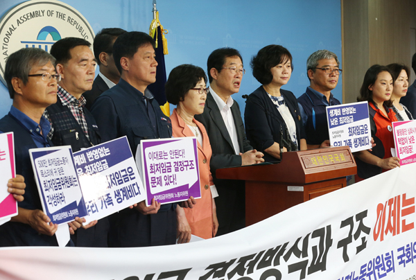 양대 노총과 국회 환경노동위원회 야당 의원들은 19일 오전 국회 정론관에서 기자회견을 열고 "저임금 노동자들의 삶의 질을 개선하지 못하는 최저임금 결정을 되풀이하는 최저임금위의 구조적 한계를 뜯어고치는 제도개선을 진행하겠다"고 밝혔다.
