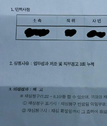 경향신문이 24일 입수한 문서(사진)를 보면 현대중공업은 지난 14일 인사위원회를 열고 “직무 재배치 이후 업무성과 및 역량향상 개선 미흡”을 이유로 ㄱ씨를 해고하기로 의결했다. ㄴ씨도 지난 15일 “업무성과 저조 및 직무경고 3회 누적”을 이유로 해고 통보를 받았다. 해고 통보를 받은 3명은 지난해 직무역량 향상교육을 받고 올해 1월 현업에 복귀한 20여명에 포함돼 있다.
