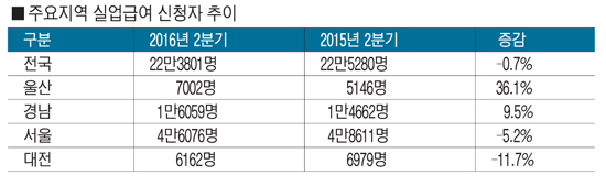 반면 울산은 지난해 2분기 5146명에서 올해 2분기 7002명으로 36.1% 증가했다. 전국에서 가장 높은 증가율이다. 같은 기간 경남(9.5%)과 전남(9.3%), 부산(7.5%)도 실업급여 신청자 비율이 늘었다.