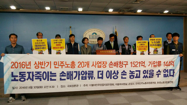 노조가 쟁의행위를 했다는 이유로 기업이 민주노총 20개 사업장에 1천521억원의 손해배상을 청구한 것으로 확인됐다. 기업이 손해배상 소송 취하를 조건으로 노조 탈퇴·해산, 해고자복직 포기를 종용하는 사례도 확인되고 있다. 기업이 노동 3권을 무력화하기 위해 손해배상 소송을 남발하고 있다는 주장이 나오고 있다.