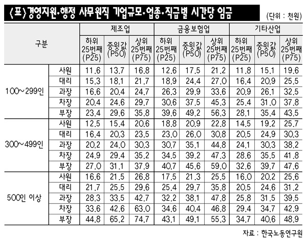 예컨대 종업원 400명인 제조업체에서 일하는 경영지원·행정 사무직 과장급 인사의 일반적인(임금 중윗값) 연봉은 5천68만8천원(시급 2만4천원)이다.<표 참조> 야간·휴일근로에 따른 초과급여를 제외한 정액급여와 상여금(월할특별급여)을 모두 포함한 금액이다. 같은 방식으로 계산한 종업원 500인 이상 금융·보험업 사무직 대리급 인사의 일반적인 연봉은 6천272만6천원(시급 2만9천700원)이다.
