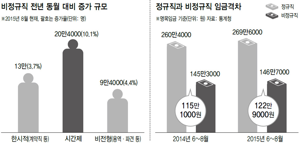 또 정규직과 비정규직의 임금 격차는 지난해 115만1000원에서 올해 122만9000원으로 더 벌어졌다. 올 6~8월 3개월 동안 월평균 임금을 보면, 정규직(269만6000원)은 1년 전보다 3.5%(9만2000원) 증가한 반면, 비정규직(146만7000원)은 1%(1만4000원) 늘어나는 데 그쳤다.