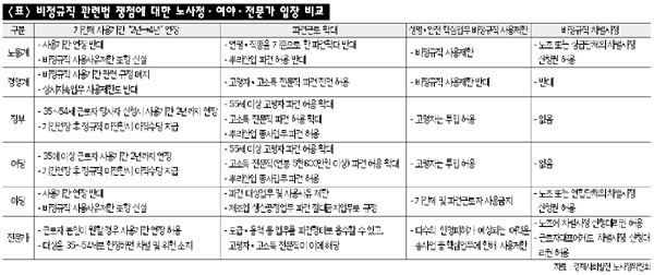 정부와 여당은 비정규직 관련 규제를 완화함으로써 고용을 유지하거나 늘릴 수 있다는 입장이다. 고용유연화에 방점을 찍고 있다는 점에서 경영계에 유리한 내용이다. 이에 반해 야당은 비정규직 규제 강화와 정규직화를 강조한다. 양질의 일자리 창출만이 사회 양극화의 해법이 될 수 있다는 것이다. 노동계 입장과 일맥상통한다. 공은 국회로 넘어갔지만 ‘정부·여당·경영계’와 ‘야당·노동계’의 강 대 강 대결이 불가피해 보이는 이유다.