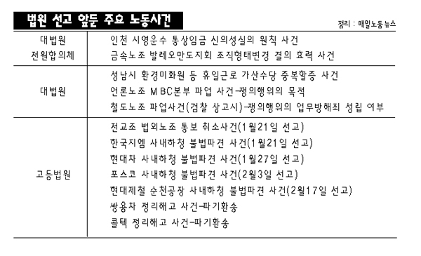 주요 노동현안이 법원에 의해 규율되는 이른바 노동사건 사법화 경향이 강해지고 있는 가운데 지난해에 이어 올해도 집단적 노사관계와 개별적 근로관계에 영향을 미칠 만한 굵직한 노동사건이 법원 판결을 기다리고 있다.
