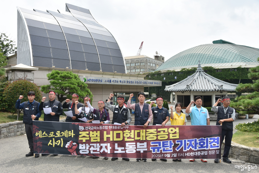 금속노조 현대중공업지부는 2일 오전 울산시 현대중공업 정문에서 기자회견을 열고 “하청노동자 임금체불을 근절할 수 있다고 했던 에스크로제도를 당사자가 어기고 불법적으로 기성금을 개인에게 송금해 노동자는 임금체불과 함께 회복할 수 없는 피해를 당했다”고 밝혔다.